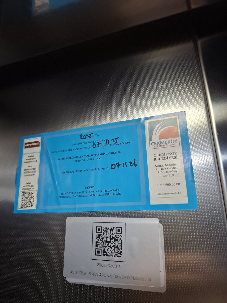 ASANSÖRÜNÜN YILLIK PERİYODİK KONTROLÜ 04 KASIM 2025 TARİHİNDE DENETİM YAPILDI VE MAVİ ETİKET ALINDI.